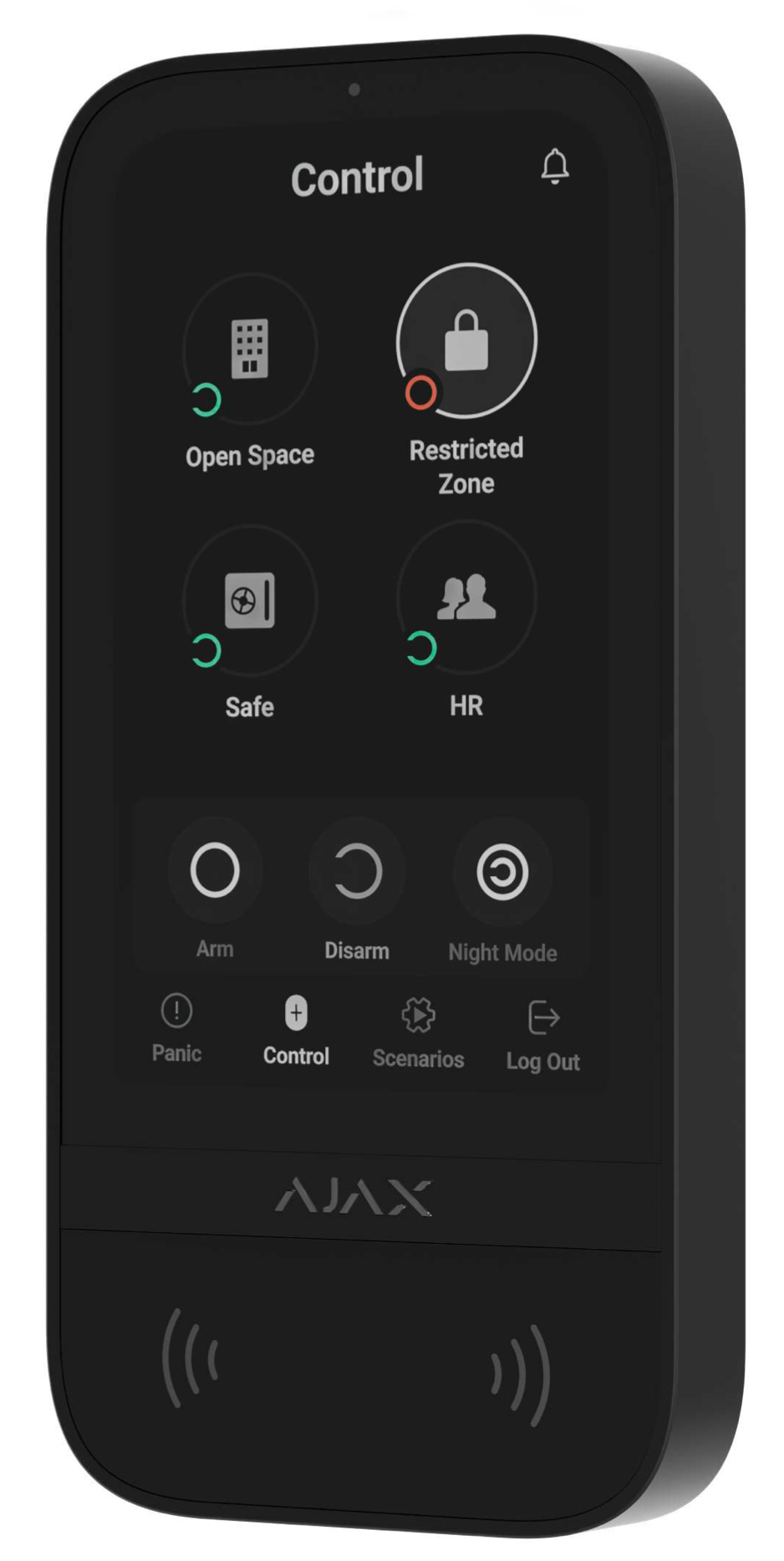 Het Ajax Touch Keypad Display is een draadloos keypad met touch bedieningstoetsen in een aantrekkelijk design waarmee eenvoudig het Ajax security systeem kan worden bediend door middel van een code of TAG of Pasje of telefoon met bluetooth.